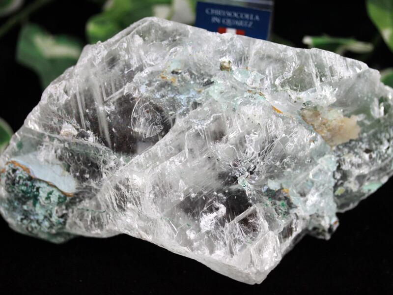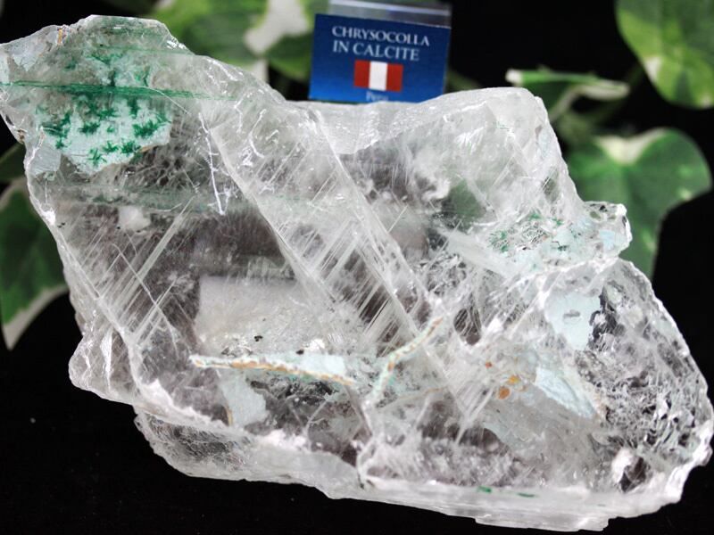 ブルー~グリーンの爽やかな色合いのクリソコーラと、深い緑のアタカマイト、カルサイト独特の劈開の強い結晶が見て取れる非常にユニークな鉱物です。