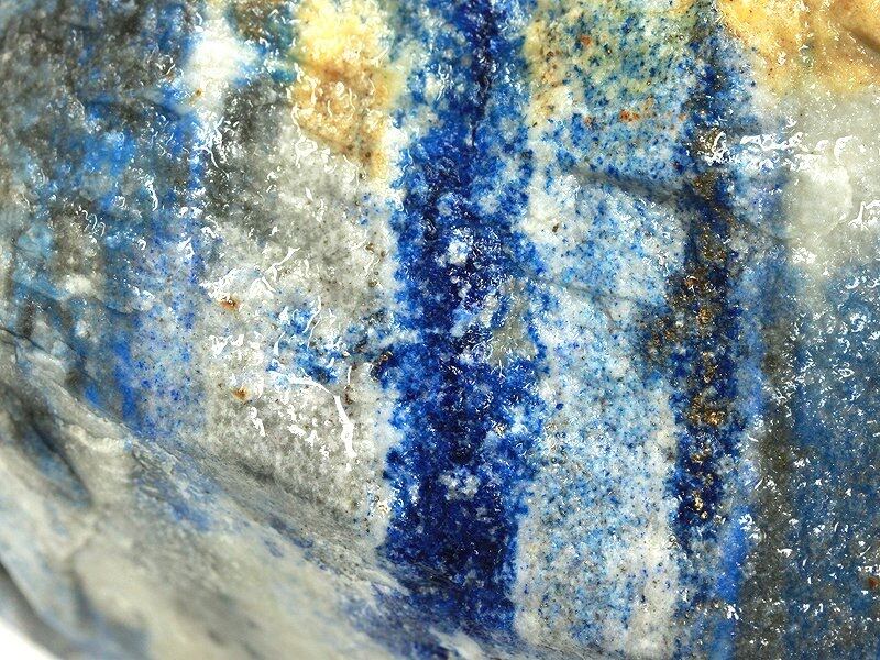 石英の白色とラズライトの青色に、パイライトの金色が混ざり、非常に美しい模様を描いています。